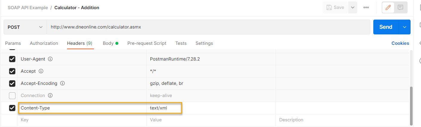 Step 2: Along with the existing headers, make sure to add the “Content-Type” as “text/xml”