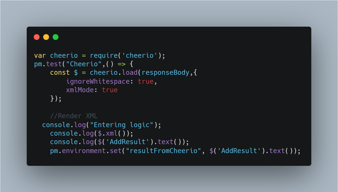 If the response is lengthy and you need to go through many tag names to reach your desired element, we have another option too. One of my favorite things about Postman is, it’s abilities to support the JavaScript libraries. One such amazing library is cheerio.js in NPM package. Any XML/HTML page can be scraped using cheerio. We can use them in Postman for parsing the XML/HTML responses. Interesting isn’t? Let’s discuss more on this.